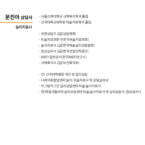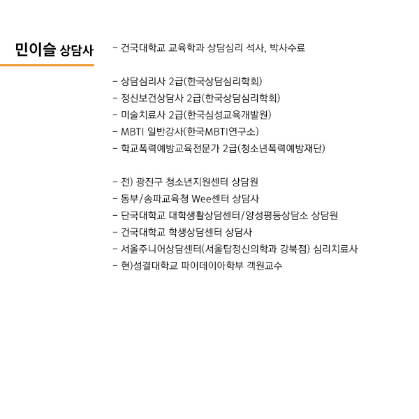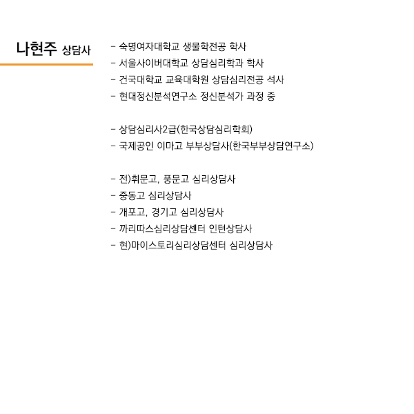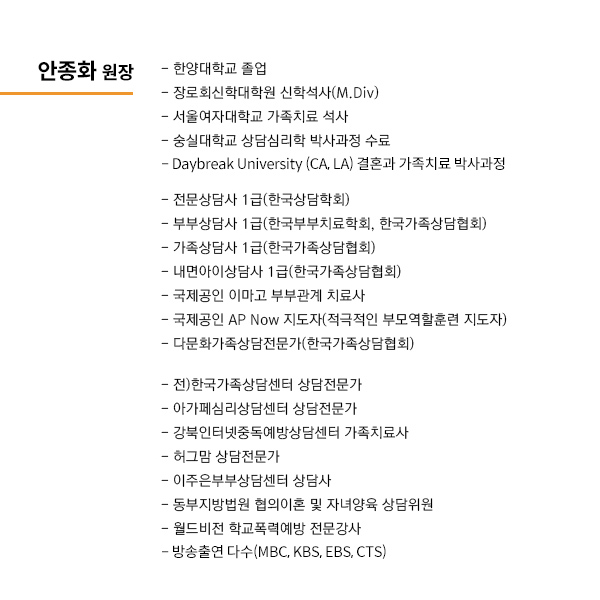 Àººû½É¸®»ó´ã¼¾ÅÍ »ó´ãÀü¹®°¡´Â ¿À·£½Ã°£ ±³À°(ÀÚ±â)ºÐ¼®°ú °­µµ ³ôÀº ¼ö·ÃÀ» ¹ÞÀº °ËÁõµÈ ÀÚ°ÝÀ» °®Ãá ÁغñµÈ »ó´ãÀü¹®°¡·Î ¿À·£½Ã°£ ÇöÀå°æÇèÀÌ Ç³ºÎÇÑ Àü¹®°¡ÀÔ´Ï´Ù.